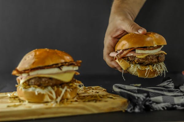 hovädzie mäso, listový šalát, slanina, čedar, volské oko, zemiaková placka, karamelizovaná cibuľa, pepper omáčka, bbq+ príloha a omáčka podľa výberu