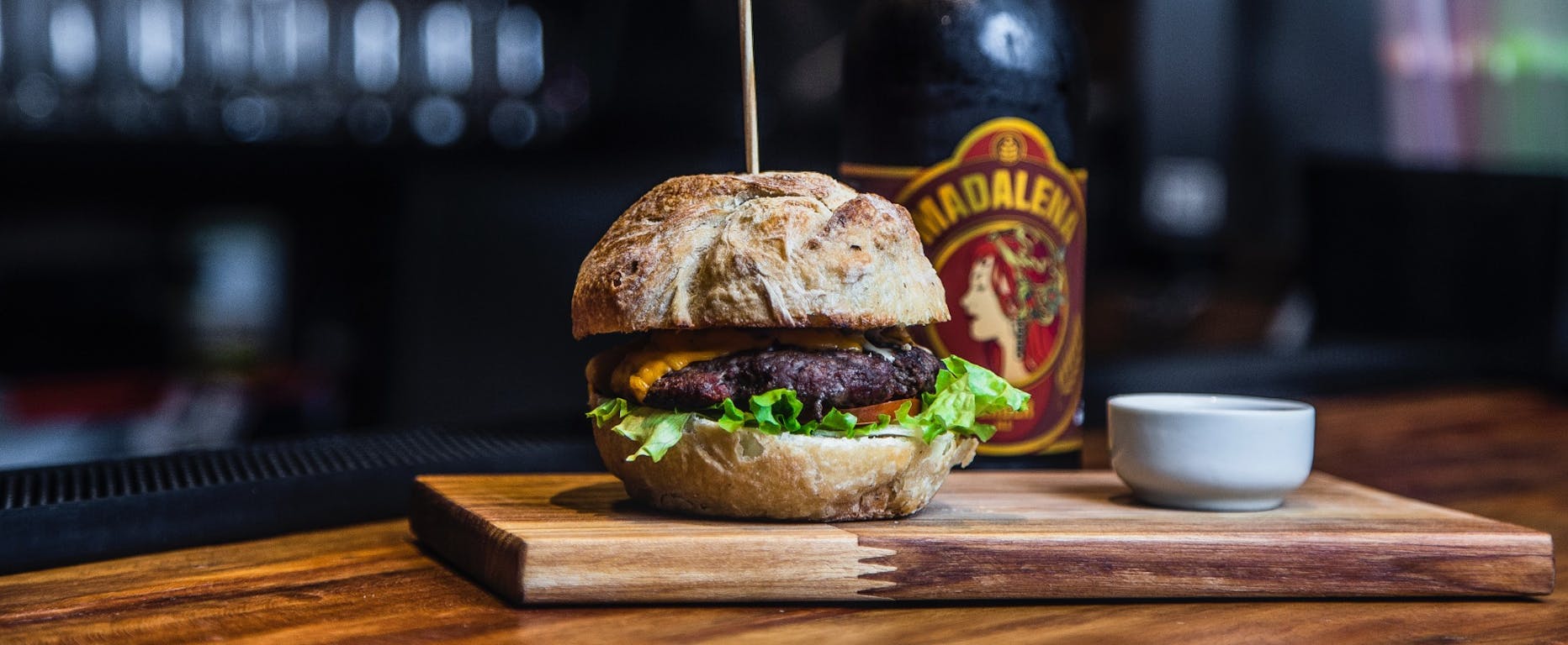 hovädzie mäso, listový šalát, slanina, čedar, volské oko, zemiaková placka, karamelizovaná cibuľa, pepper omáčka, bbq